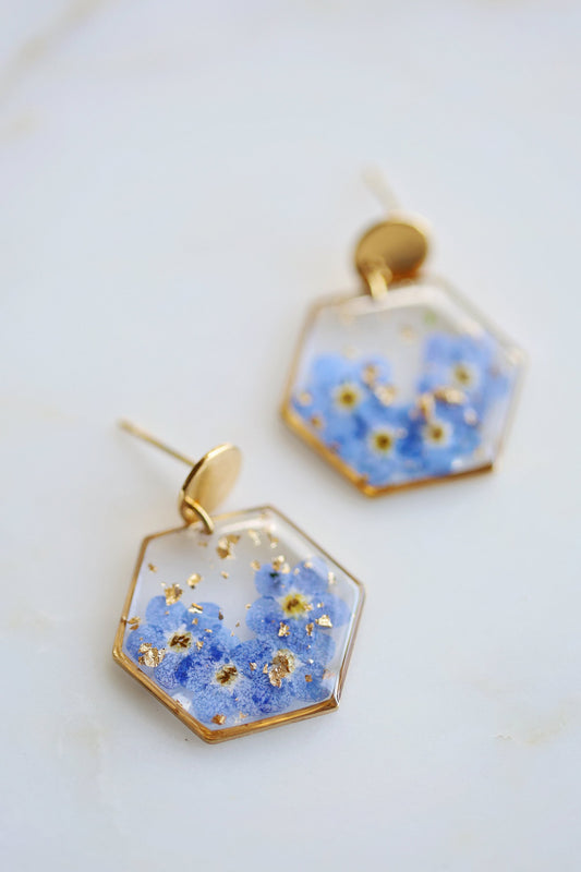 Forget Me Not Hexagon Resin Dangle Earrings | Necklaces