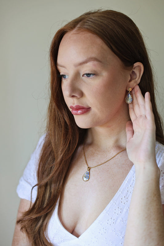 Forget Me Not Teardrop Resin Dangle Earrings | Necklaces