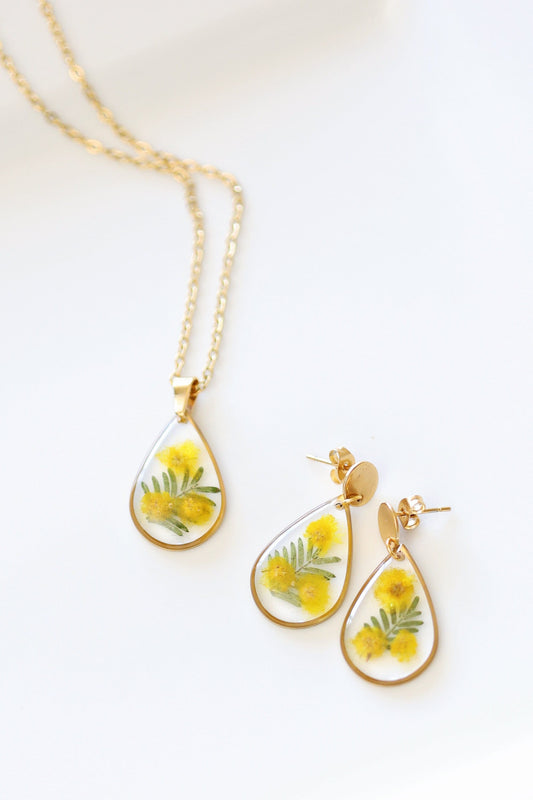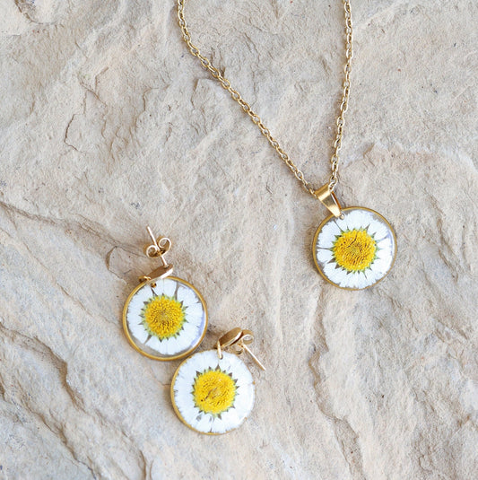 Pressed Round Dried Daisy Flower | Necklace and Earrings Botanical Jewelry | 18K Gold plated metal | Stainless steel