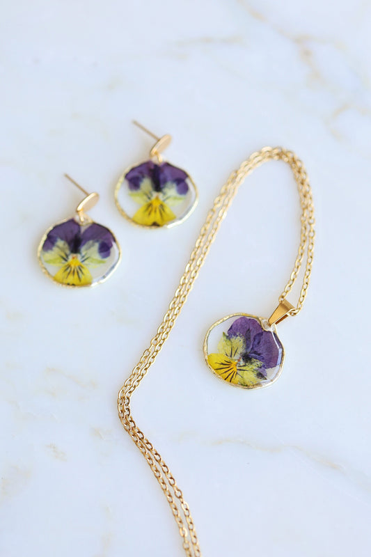Dried purple Pansy flower in Resin | 18K Gold Plated | Round shaped | Botanical jewelry